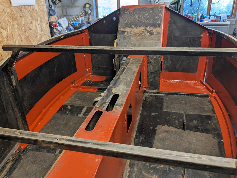 It's a short wheelbase Type 1 according to Al and unusually the bonnet and scuttle are two separate pieces. So far I've stripped it back to a bare chassis so I could turn it over and treat some minor rusty areas at the rear where the bulkhead meets the side panels. I've also drilled out the lower rear rivets on the side panels in order to treat those areas for minor rusting with a neutraliser and paint. They've then been bonded with uPVC mastic and rivetted to the chassis rails with extra rivets.