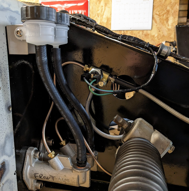 I've also replaced the whole braking system and converted it to use the braided hoses as on current Trikings as well as remote reservoirs for the master cylinders. I've run the hoses up inside the turrets, similar to modern Trikings athough the sheet metal rather than tubular front chassis gives more scope for mounting the other hardware.