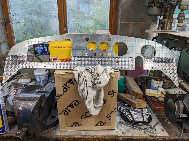 I have a pedestal drill so I bought an engine turning tool off eBay which was made of oak with an abrasive head. The shank was 10mm diameter and the head was 25mm. I marked out a matrix on the dashboard using a Sharpie type marker pen. I used some spray can light oil to lubricate the tool and held the head against the dashboard for a count of five. This was repeated many times such that the circles made by the head overlapped. The photo below shows the dash roughly halfway through the process. You can see the pedestal drill top right with the tool in the chuck. You have to do the circles in the right sequence otherwise it can look odd and I found that when the tool was on the edge of the dashboard I had to be careful that it didn't grab or get misaligned. The next photo shows the dashboard with the turning completed and wiped down ready for clear coating. I used an aerosol satin finish spray from Toolstation that is suitable for coating aluminium. The last photos shows the dashboard in the Type 1 with gauges and switches fitted. Overall, I'm fairly happy with the result.