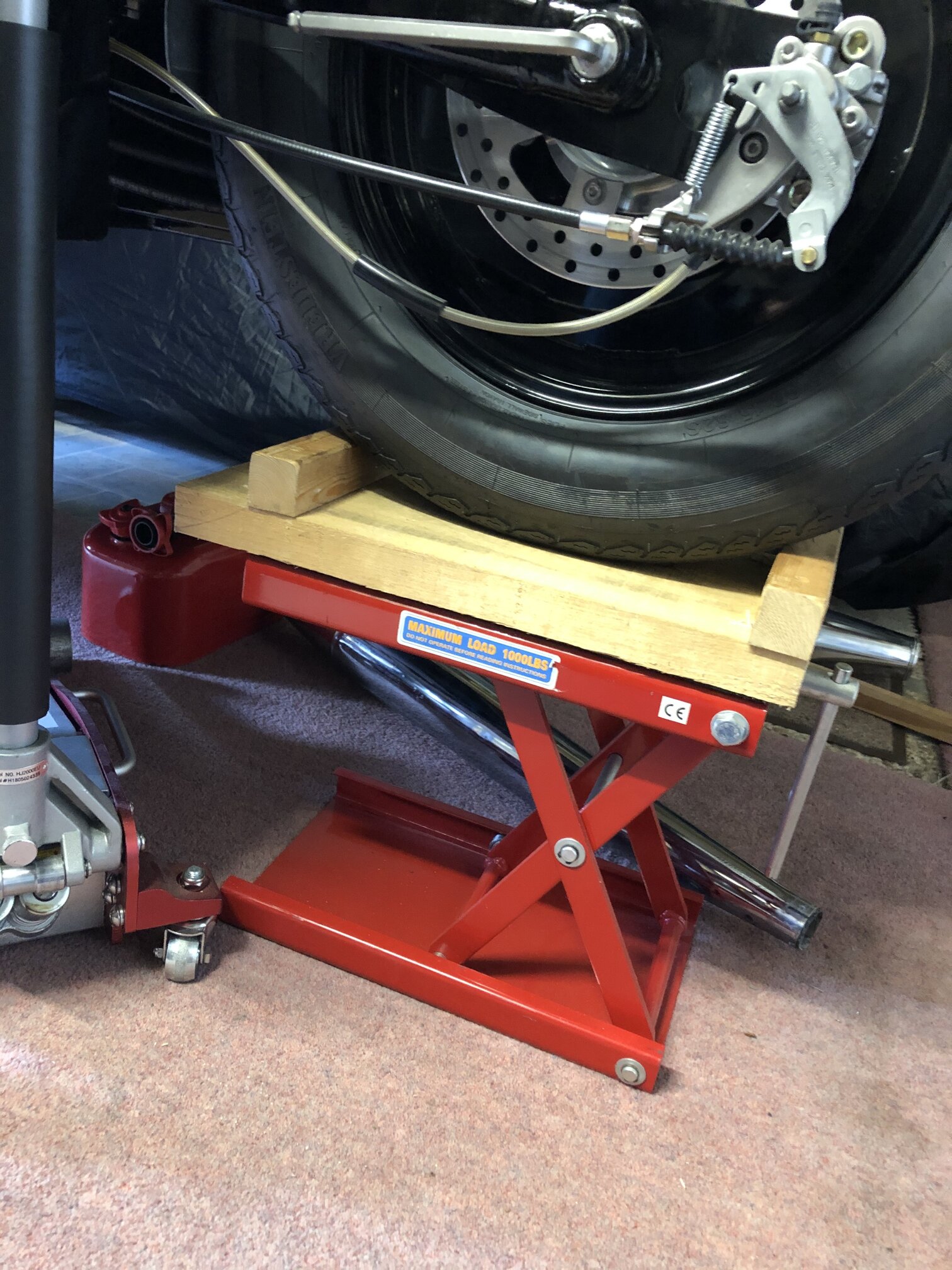 I use a wooden fence post located just in front of the rear wheel, Jack it up with a small trolley jack in the middle of the post and place axle stands at either end. Do the same at the front with another fence post under the chassis in front of the engine. Quick, stable and easy but won’t achieve the height of other methods mentioned.