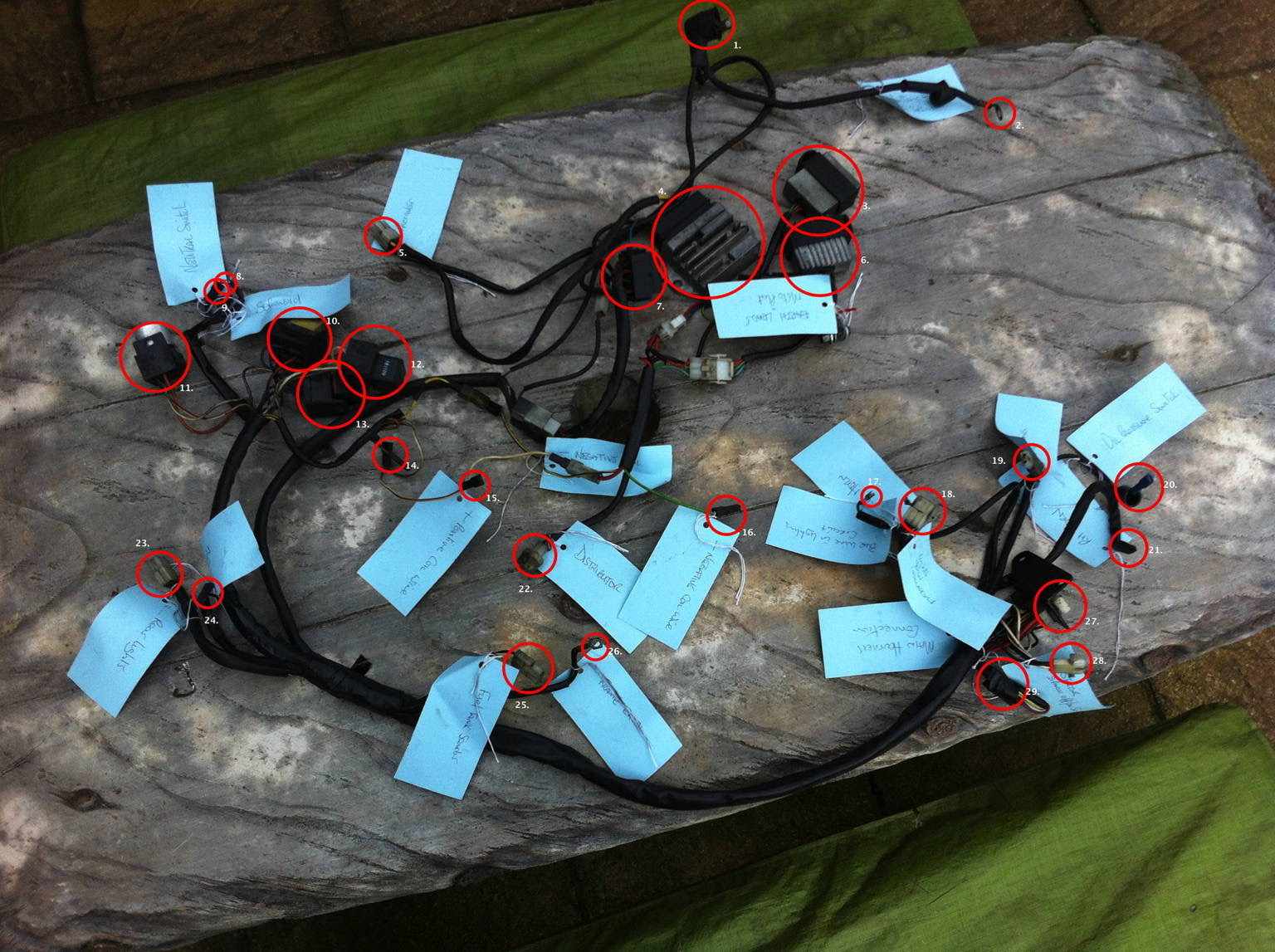 I used the original Cali loom in my build, not sure whether I would use it if I started a another build; however, I’ve never had a problem with my electric’s. I’ve attached a picture of my loom when removed from the bike, I attached labels to each connection to assist with the fitting. Some cables had to be shortened and some lengthened. Not the prettiest wiring job but functional. For the wiring of the lights I used the standard seven core cable, the type used to wire trailer board lights.