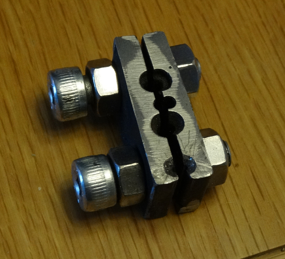 Construction: Bolt 2 pieces of stout m/s plate together with a sheet of not-too-thin paper between. Drill hole on split line same size as inner wire, countersink one end of hole.