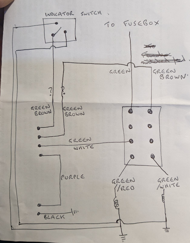 I meant to draw more bulb symbols instead of earth symbols - I was in too much of a rush! So the green/brown wire goes to the indicator switch which then directs it to the left or right side indicator. What I really need is to know what the hazard rocker switch connections are when the switch is operated. If I can just plug in a switch to that connector block it saves some rewiring time...