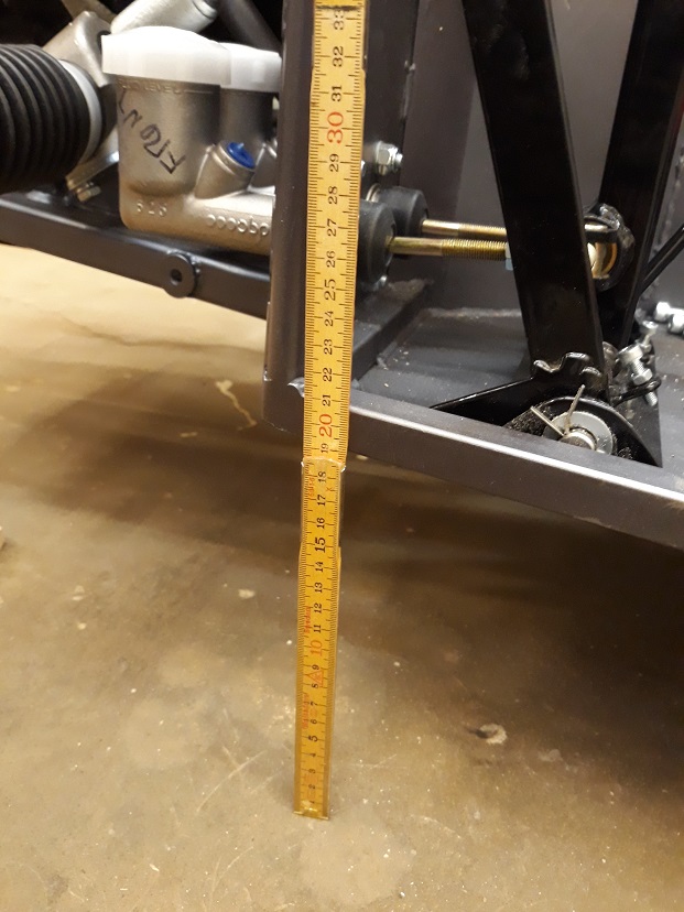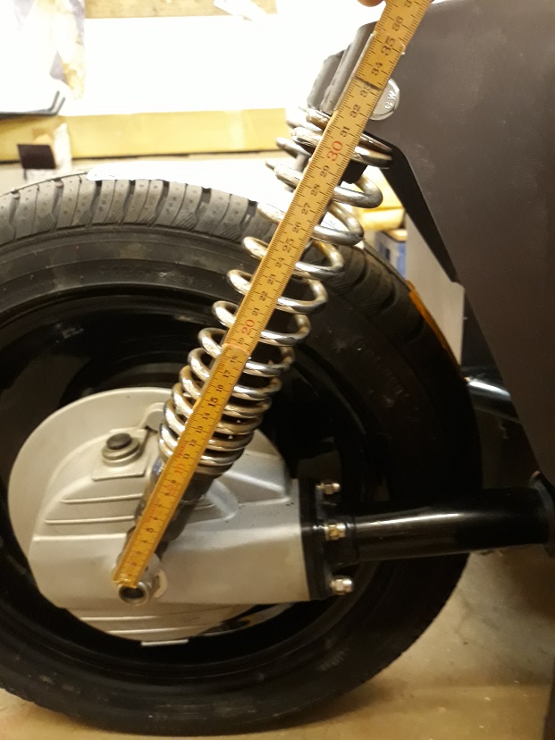 The last (well, but..) parts arrived and i could finally put i down on the ground. It leans a bit backwards, ca 19 cm ground clearance in the front and 12 cm rear. I got the front shocks from Triking and the rear is used MG California (ca33 cm). Can i use those shock absorbers if i put an extension on the top end? Think i seen others do it that way.