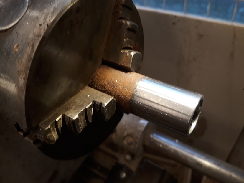 Our lathe is built for wood but can be persuaded to deal with metal too. Here for polishing a bit of pipe for the outer spacer for the rear axle. Is this correctly mounted? The brake plate is resting on the outer spacer. It looks the same as others to me. Do i need to restrain it sideways too? I am building a stopper so it can't start turning when i brake but it can wiggle about a little bit sideways. Is that all right?