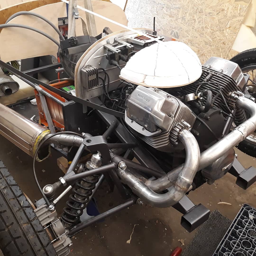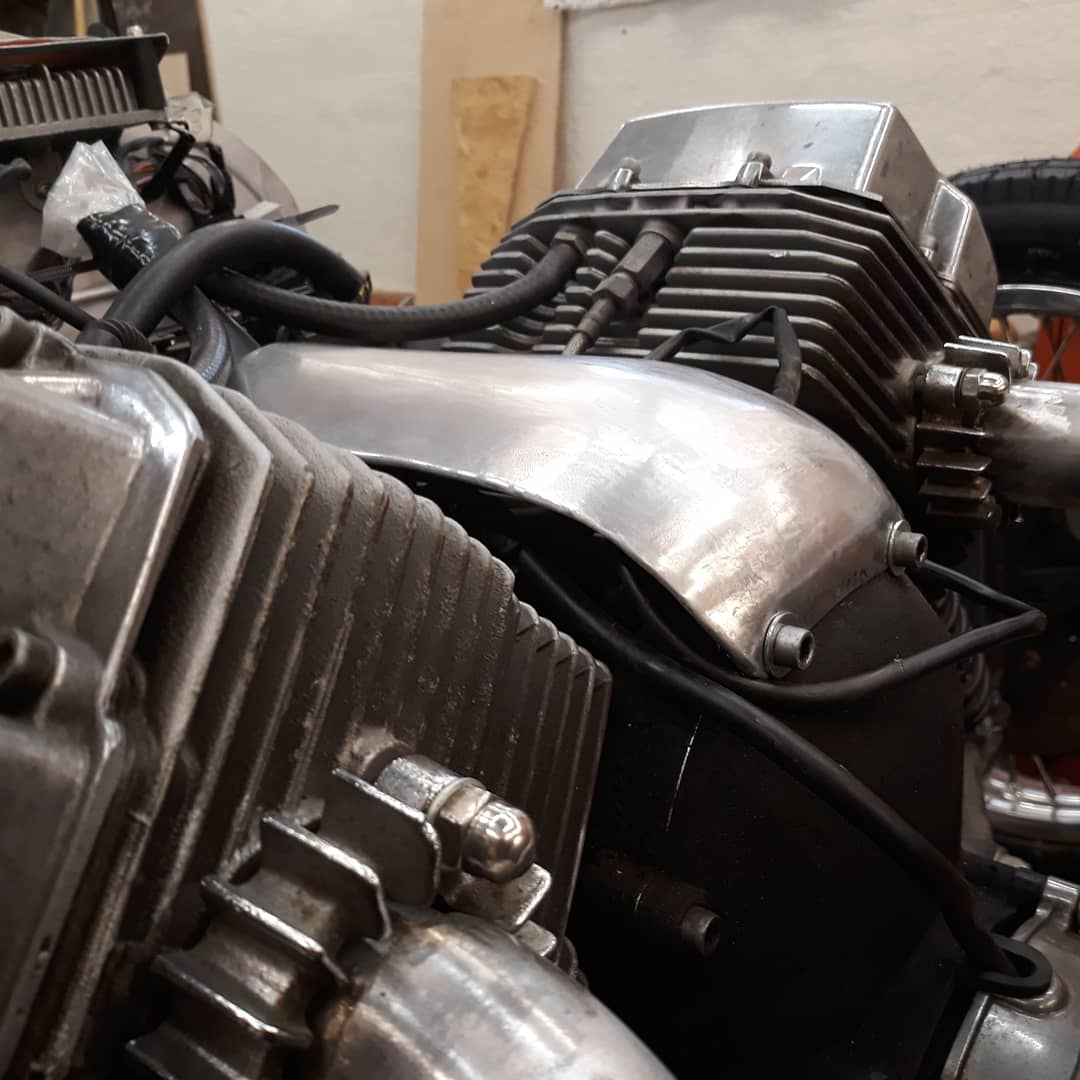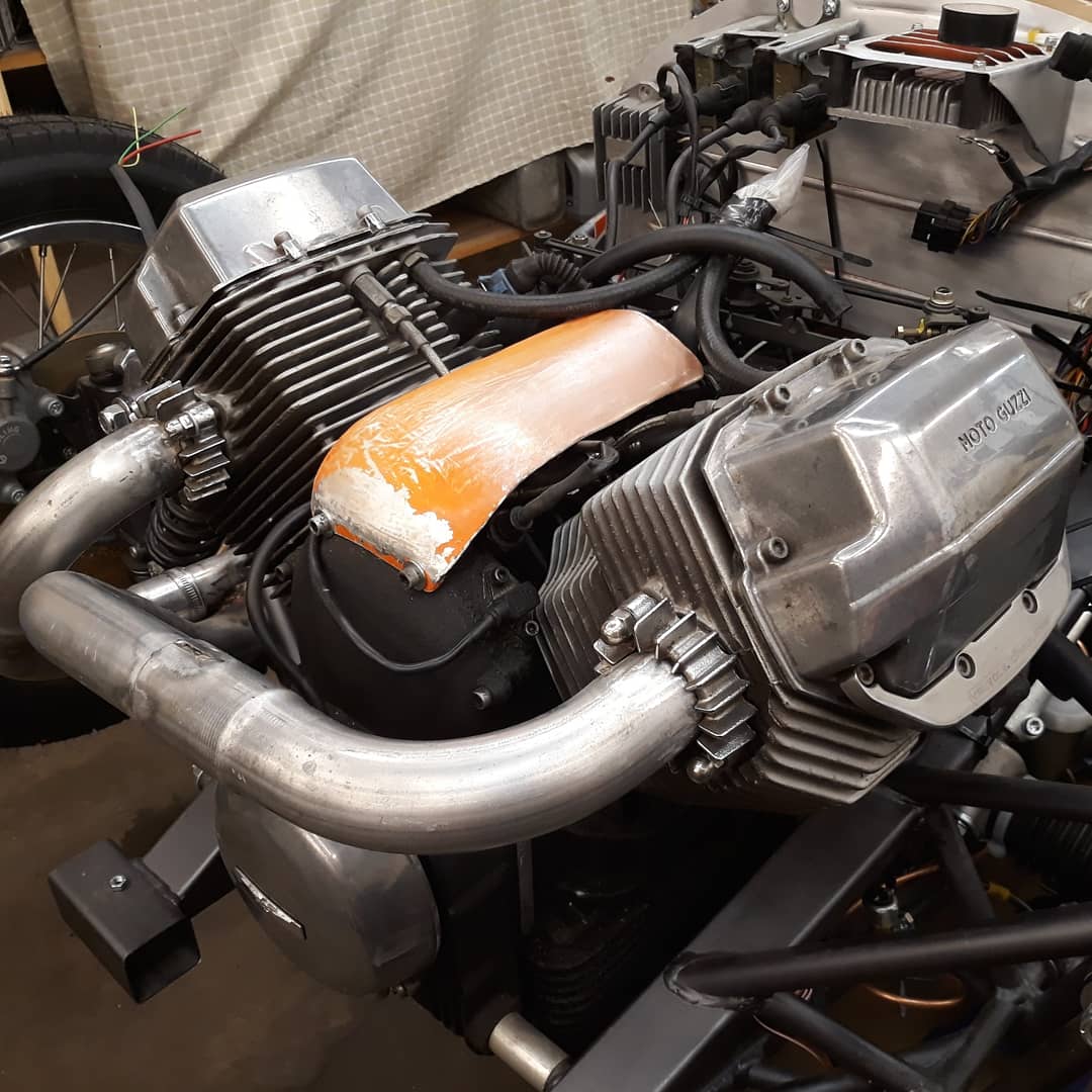 I also mocked up an exhaust system. Instead of the usual way of using the original Moto Guzzi exhaust i made one myself that ends up on the passenger side. The finned exhaust flange are from some other Guzzi, the bolts fitted but the pipe diameter is 48mm now so some pursuation was needed.