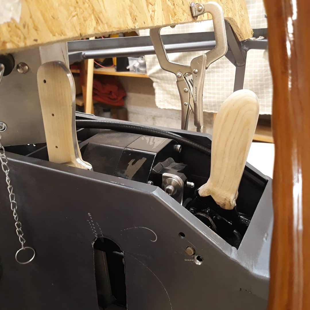 I found a light weight catch tank for the reverse gear box. Just added some pipes and fittings. A temporary fuel tank has been set up for test drive, maybe even this weekend if i get all some other things done first. I tried the little english wheel on a cover for the engine. It was fun to make but i consider it a test piece. All the linkage for the gear levers is finally connected and works smoothly at last. Just need to find a good coating for the handles so they wont get dirty at once.