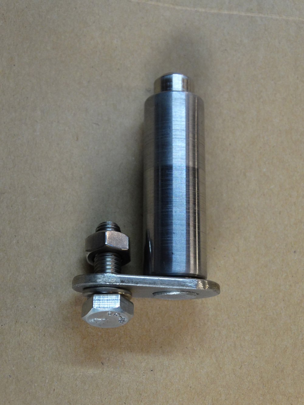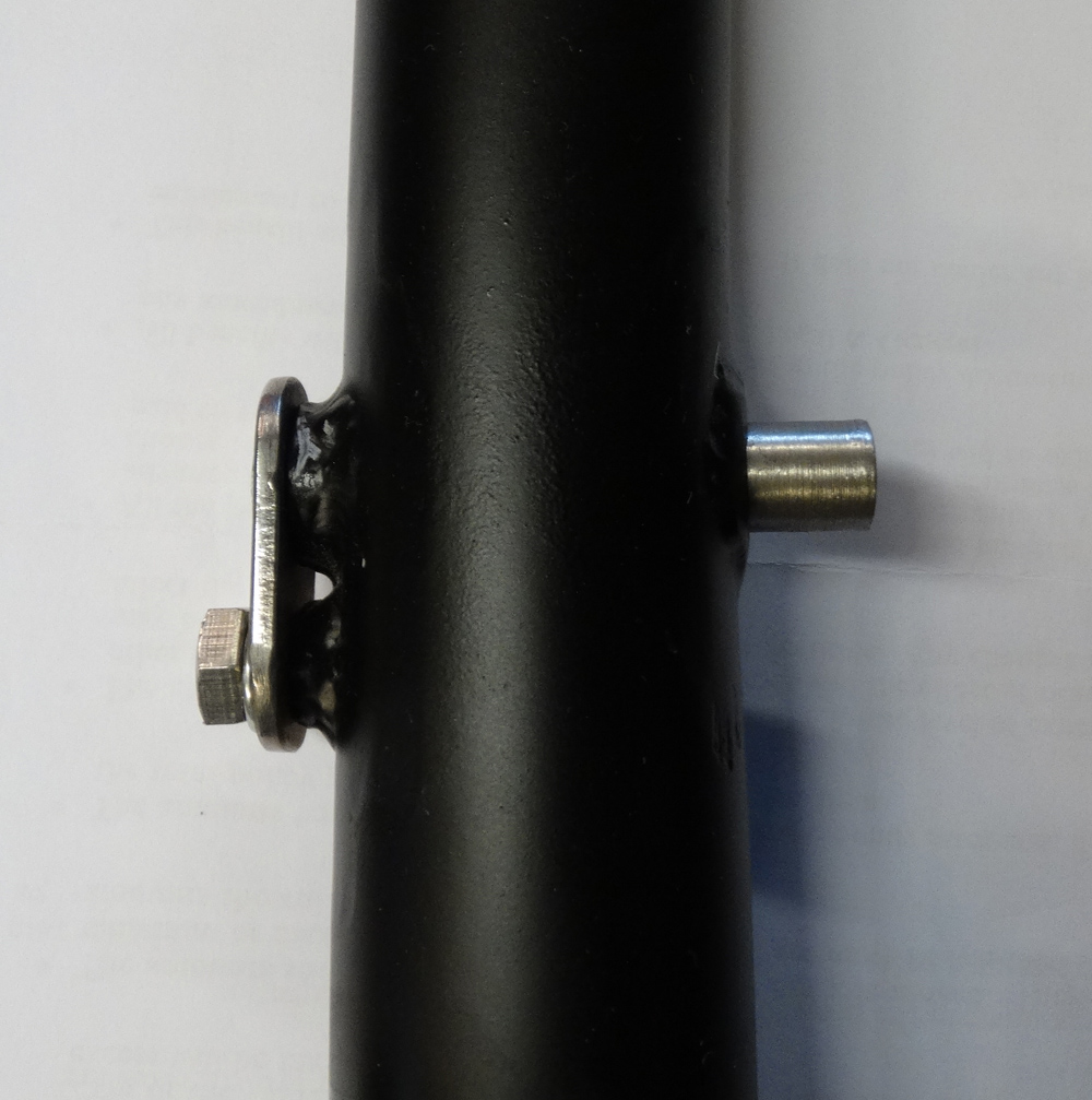 The solution I came up with, with a bit of help from Al with the stainless components, is to weld a ½” bore tube into the s/arm leg, weld a plate onto end of ½” solid peg, then secure that in position with an M8 bolt.