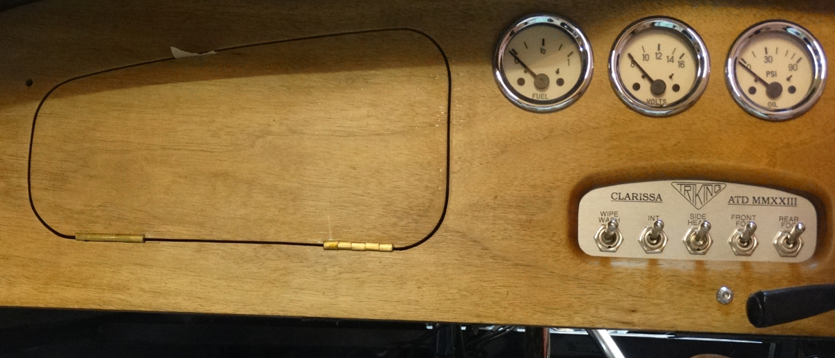 The instrument holes were cut with a router. 6mm cutter with sleeve guide, plunged through in increments. The guide template was cut from 6mm MDF using the jigsaw and finishing by hand. Test hole cut in scrap before cutting the dash! This then gave repeatable accuracy.