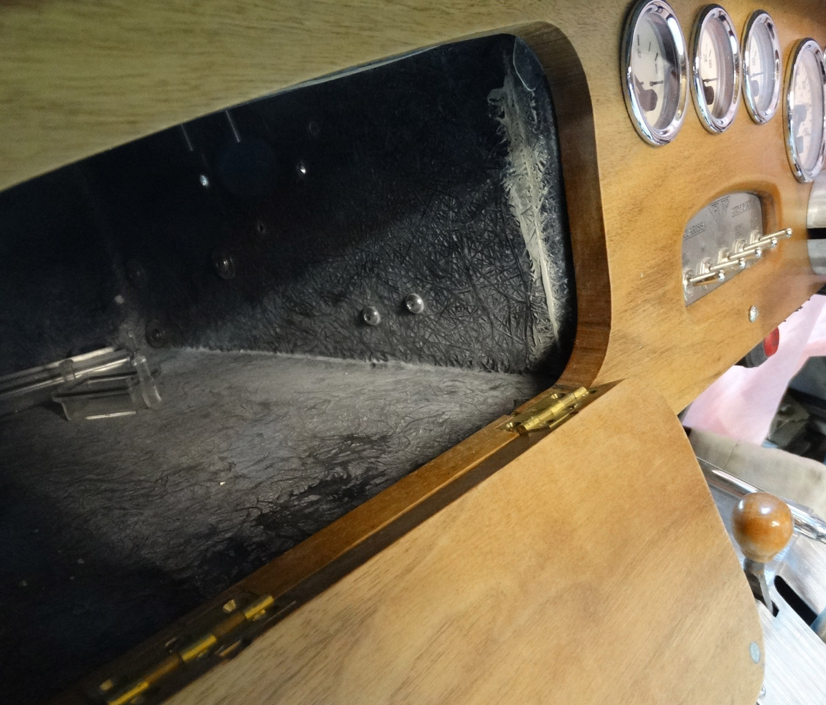 Glove box aperture was positioned from Al’s template. Cut with a jigsaw using a fine blade (T101ao on the Bosch list). Initial penetration slot 2mm wide drilled at one of the hinge positions.